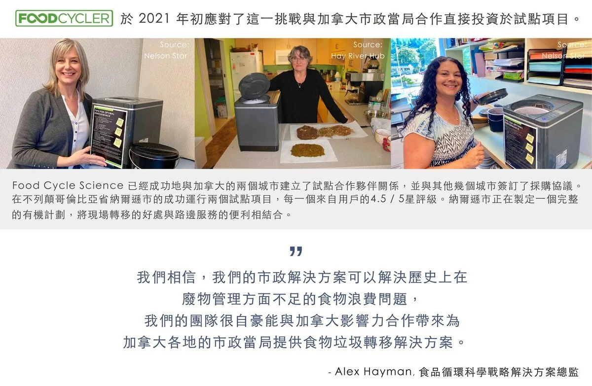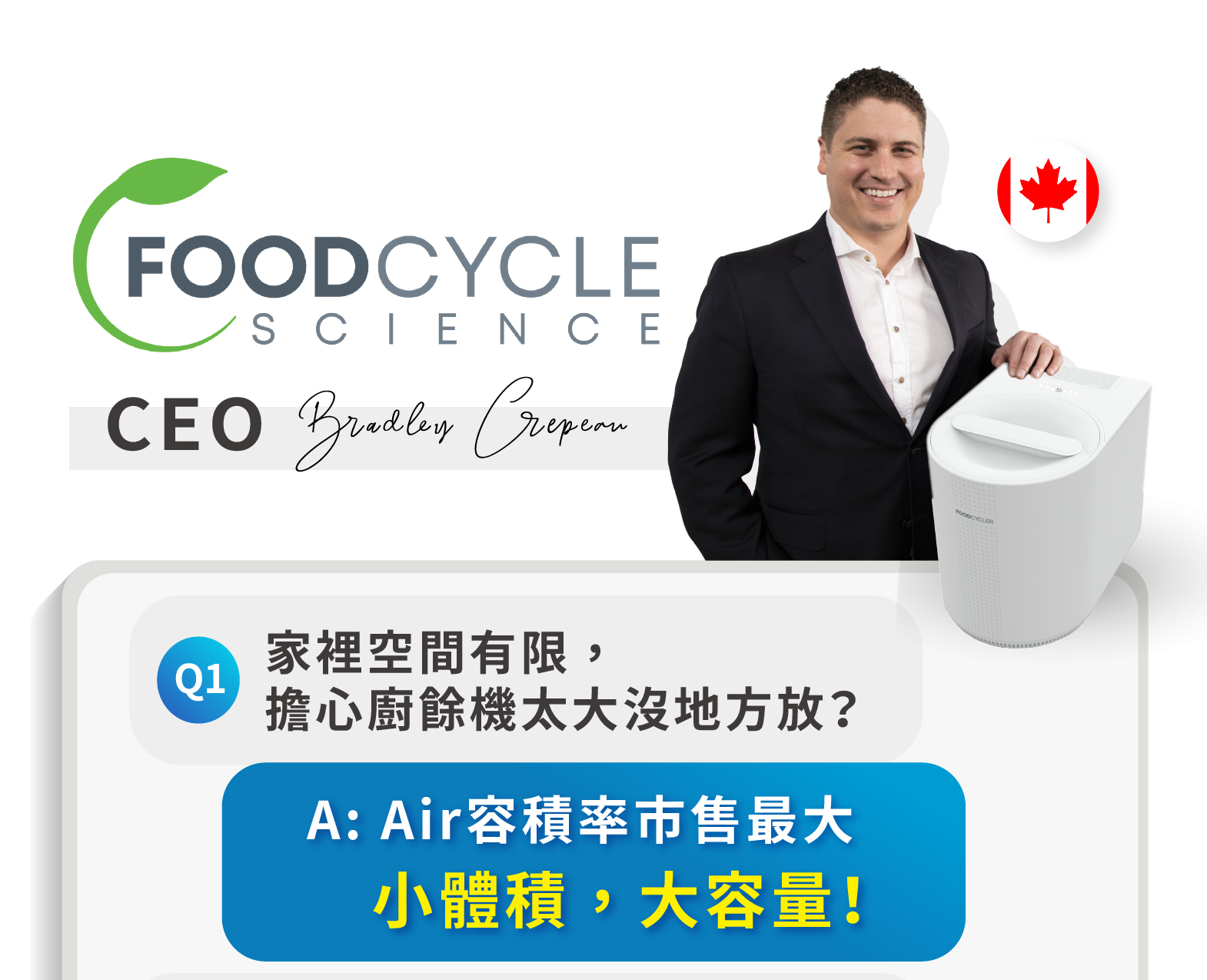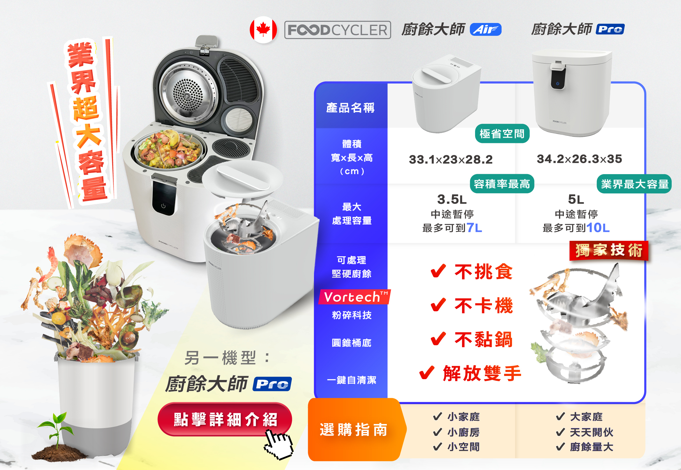 加拿大FoodCycle Science與美國百年品牌Vitamix聯手,全球同步推出「廚餘大師Air」,把廚餘機的體積縮小,廚餘桶容量調整為3.5L,剛剛好的容量,容積率為市售廚餘機最高,更適合小宅、小空間、小家庭與個人使用。
