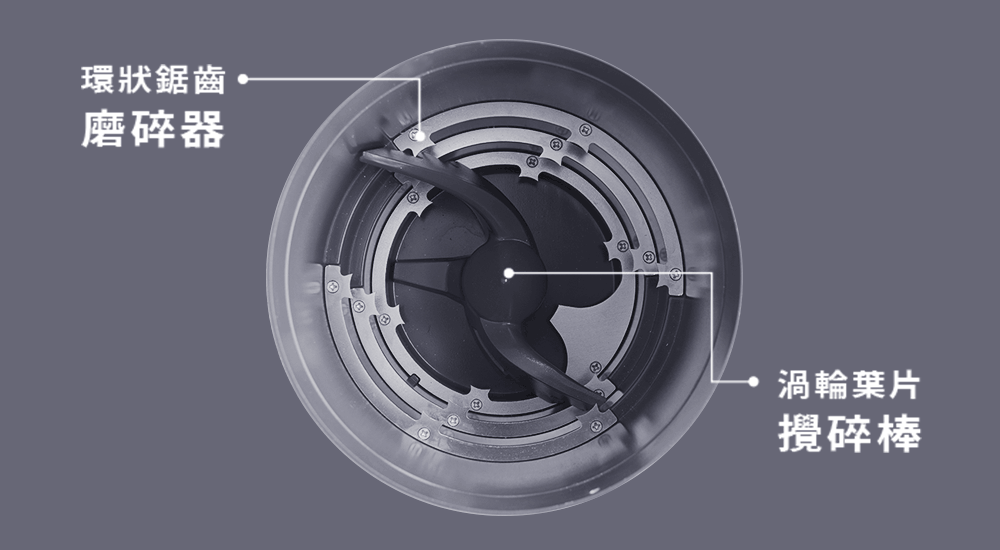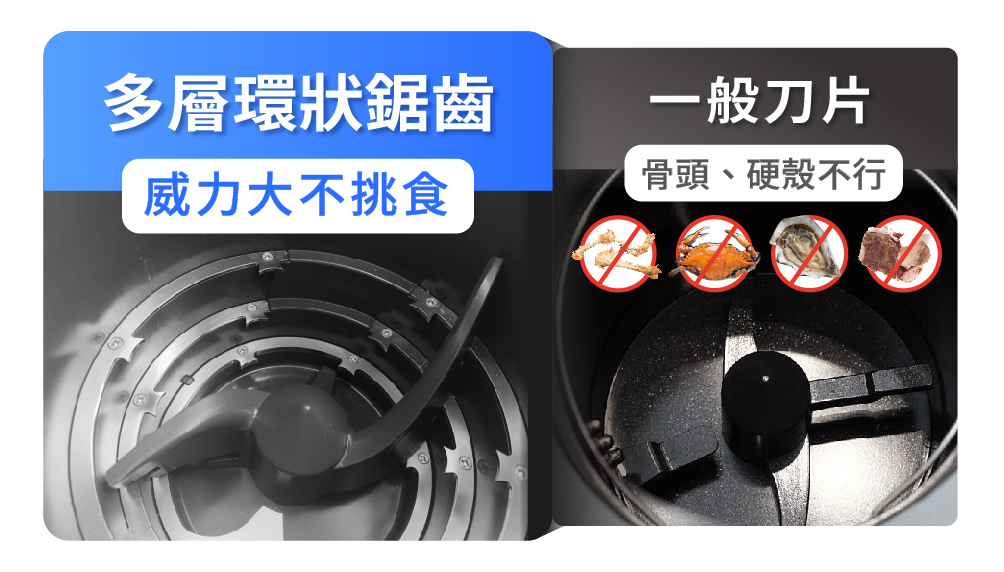 | 特色2|多層環狀鋸齒設計 有效處理各式廚餘廚餘種類百百種,市售它牌廚餘機礙於廚餘桶單一磨碎器設計,可以處理的廚餘種類有限!每次處理必須手動挑掉硬骨、硬核,有夠麻煩。 |