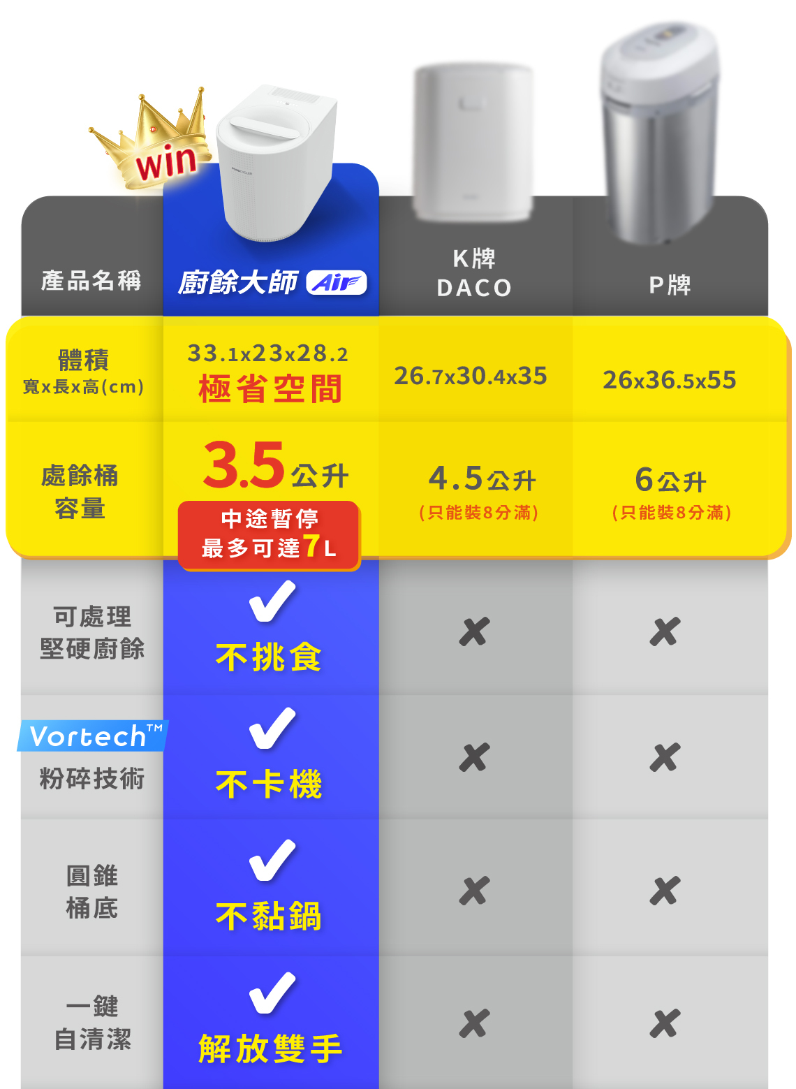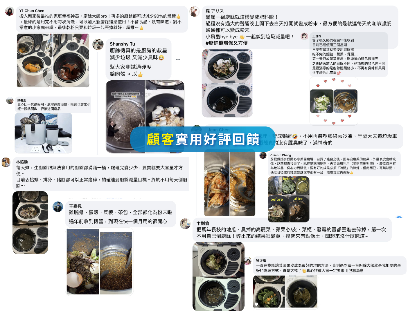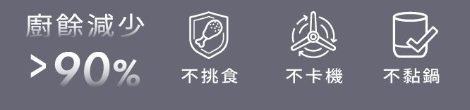 從廚餘大師Pro沿用到廚餘大師Air,持續帶給大家高效率、不挑食、不卡機、不黏鍋的廚餘機。高溫乾燥與研磨技術,讓廚餘體積最多可以減少95%,讓你擺脫每天倒廚餘、追垃圾車的命運。