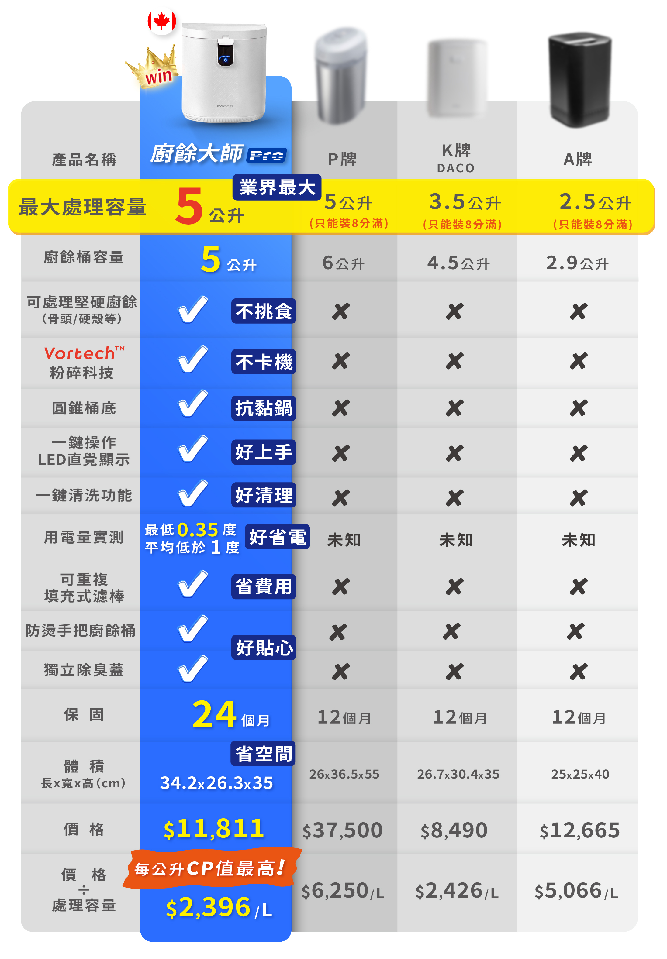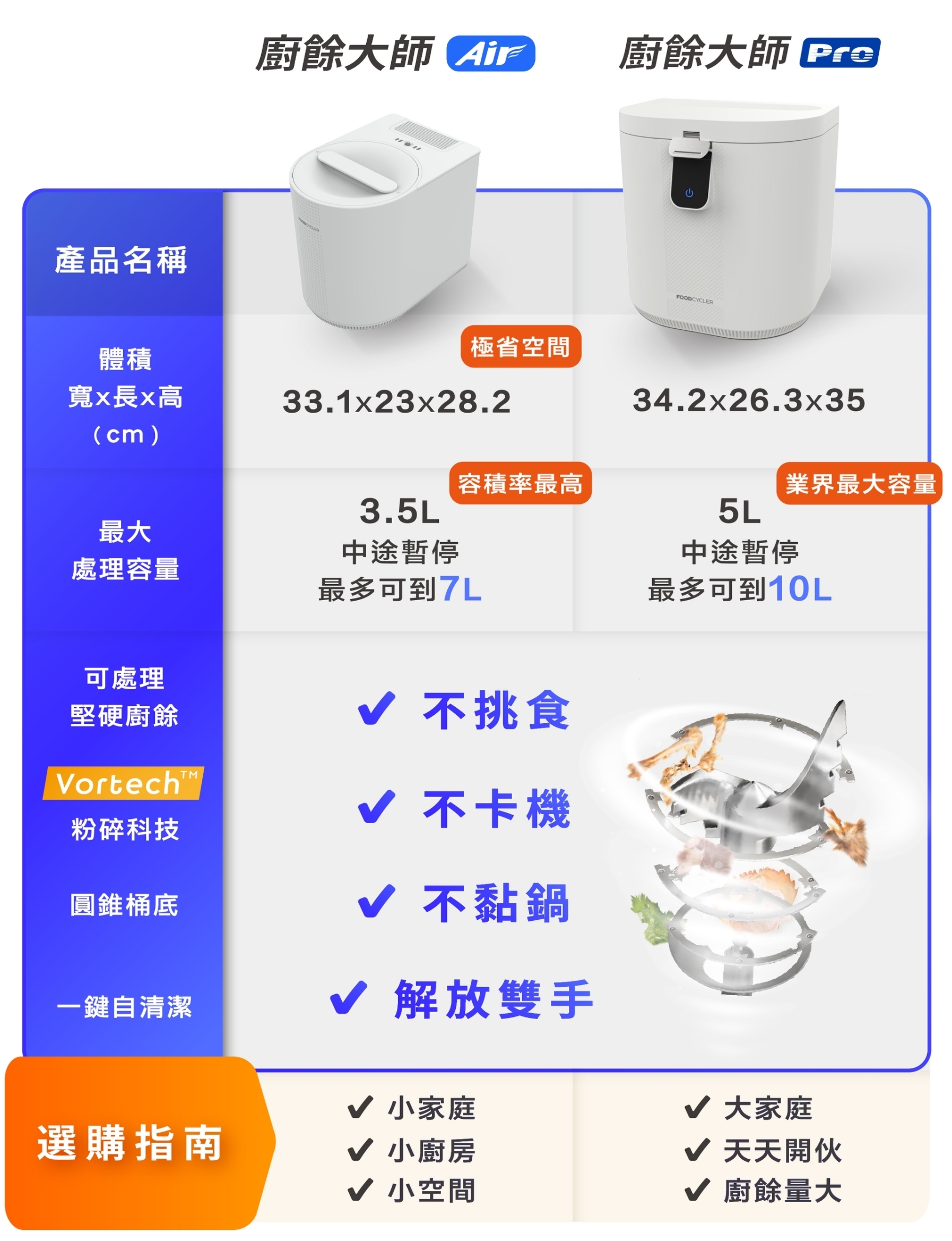 廚餘的種類五花八門,目前市售的廚餘機礙於設計,通常無法照單全收。全新的廚餘大師Pro搭配環狀鋸齒設計,能應付各種形狀、體積、硬度的廚餘。