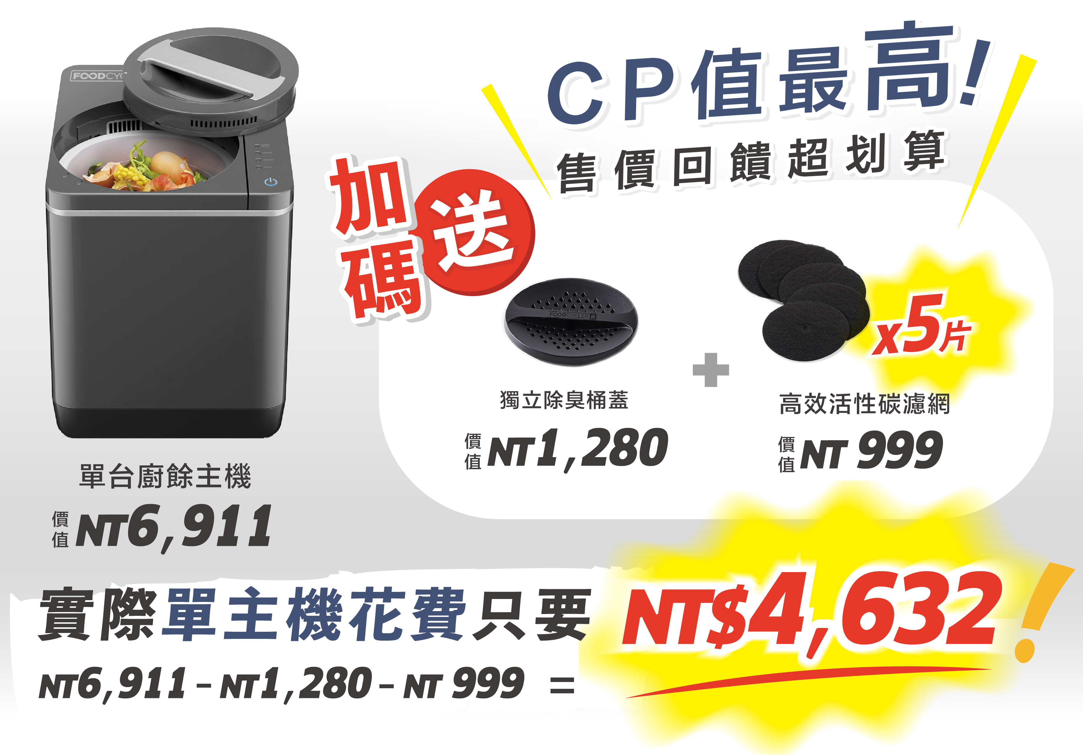 兩口之家或是單身貴族不想天天處理廚餘?廚餘大師也幫你想好了!獨家設計廚餘桶專用除臭桶蓋,含有活性碳濾網設計,可將廚餘放置在廚餘桶內並蓋上,多天累積後再一次使用機器清理,節能省電同時也防臭防蟲,完美契合生活習慣。