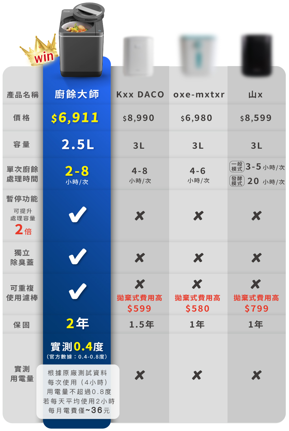 廚餘大師擁有市面上同類產品最佳的省電設計,最高功率僅500W, 而根據原廠測試資料,每次使用 (4小時) 用電量不超過0.8度,若每天平均使用2小時,每月電費僅~36元 (以一度電費3元計算),卻幫您省下數百元專用垃圾袋的成本,生活節約小天才就是你。
