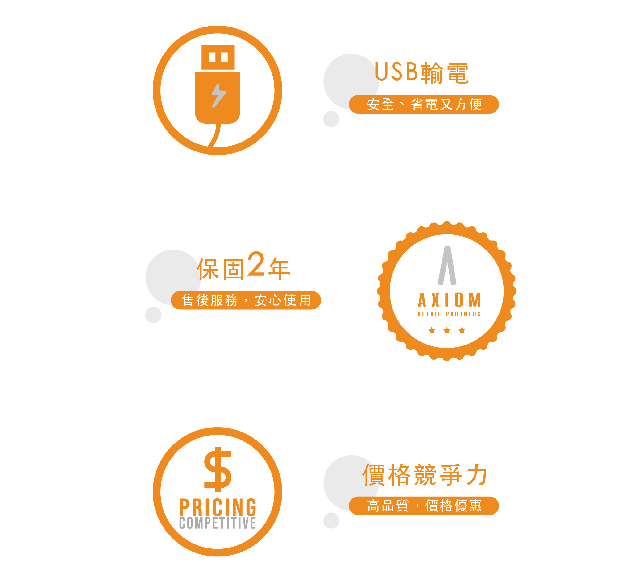 一組得過設計獎項,有著創新、簡約時尚的外表、360度無死角均勻照明、USB供電安全省電系統、多用途可串接的燈組,卻只要市面上燈具一半的價格,同時也提供兩年保固,讓您使用無後顧之憂,輕鬆為家中更換優質燈光。