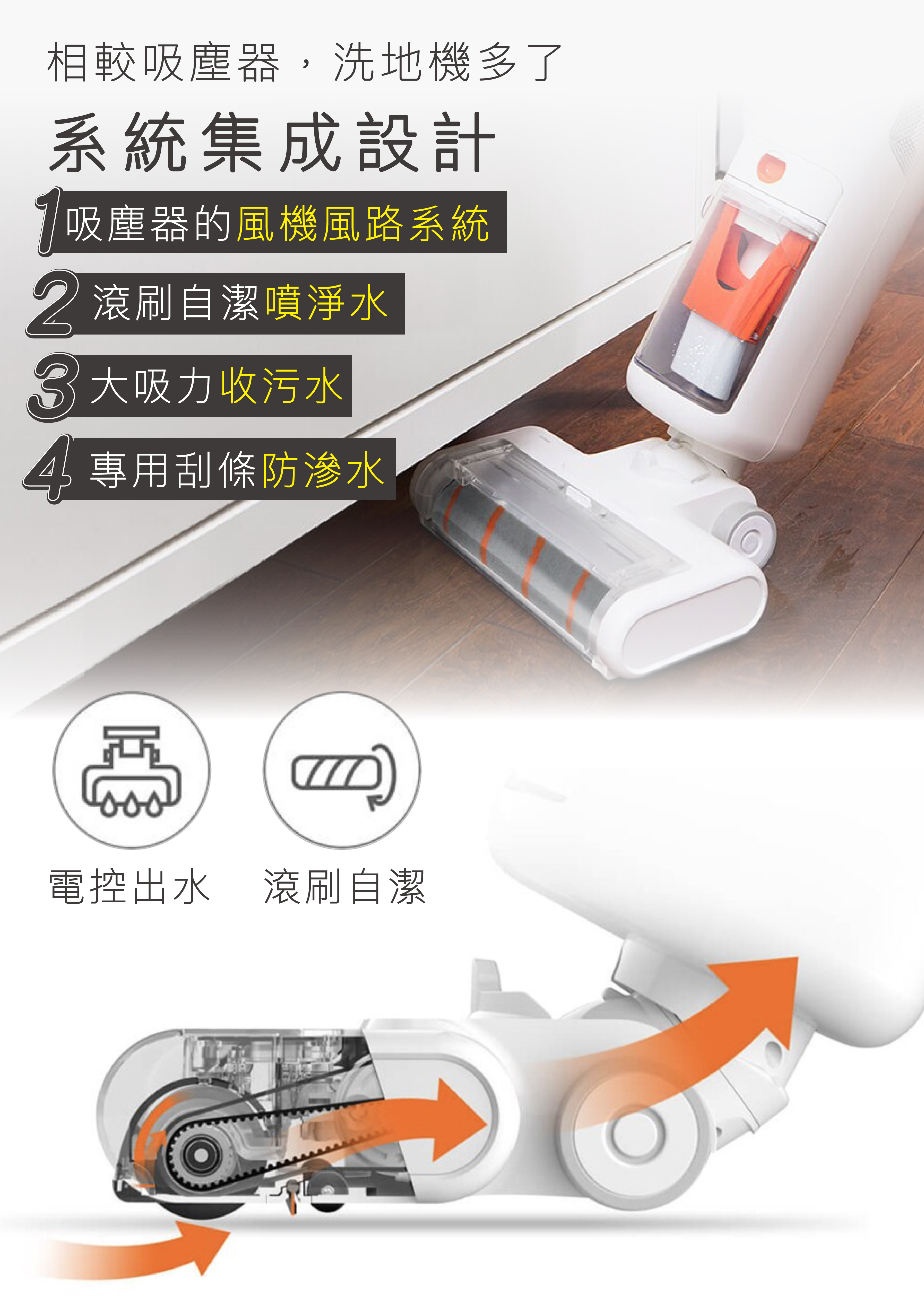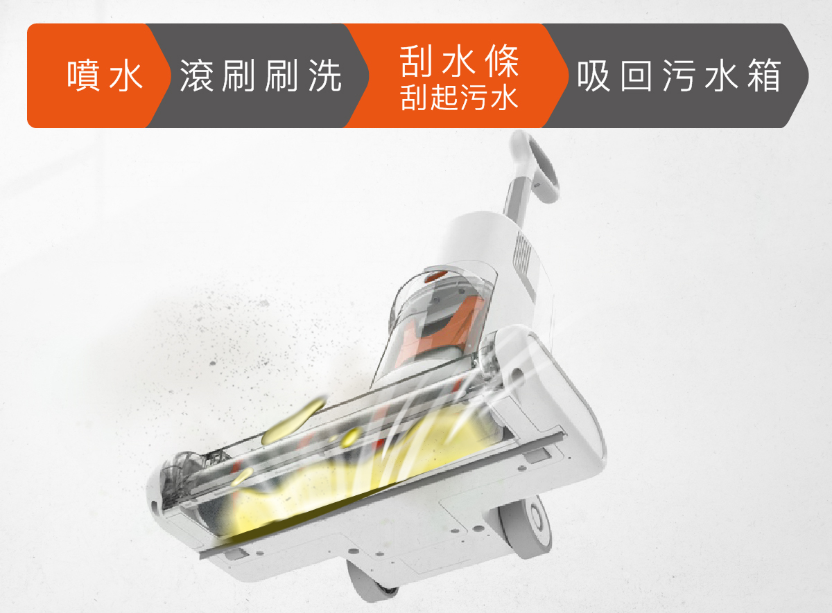 刷洗地板的設計就是一套完整的工序,搭配強力刮水條不讓污水藏在地面!