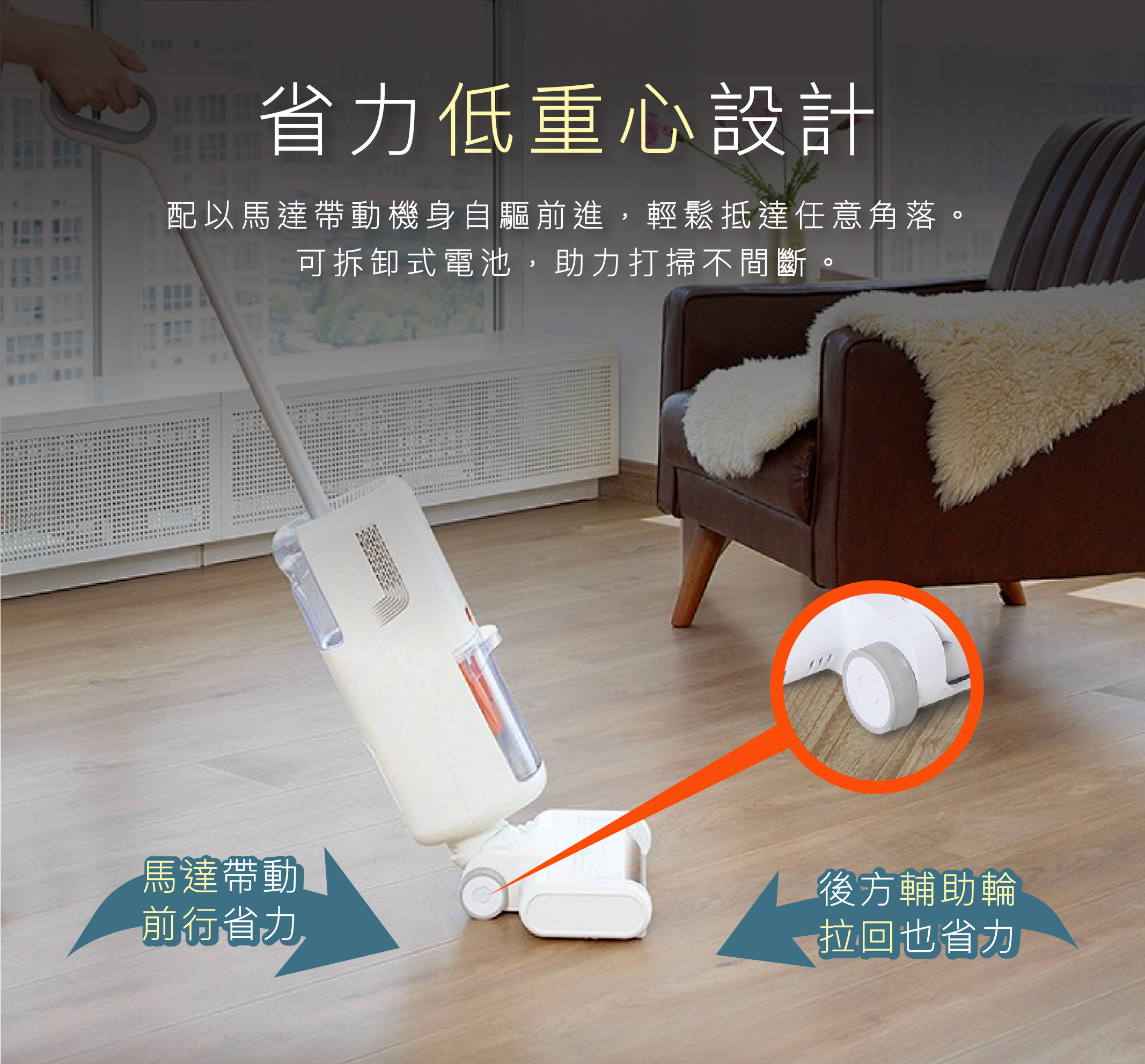 講起來不輕,用起來卻像歐洲車一樣穩重順手!速吸拖採用低重心的設計,往前推超省力,老人家也可以一手輕鬆使用,高性能的設計也不會讓重量成為負擔。