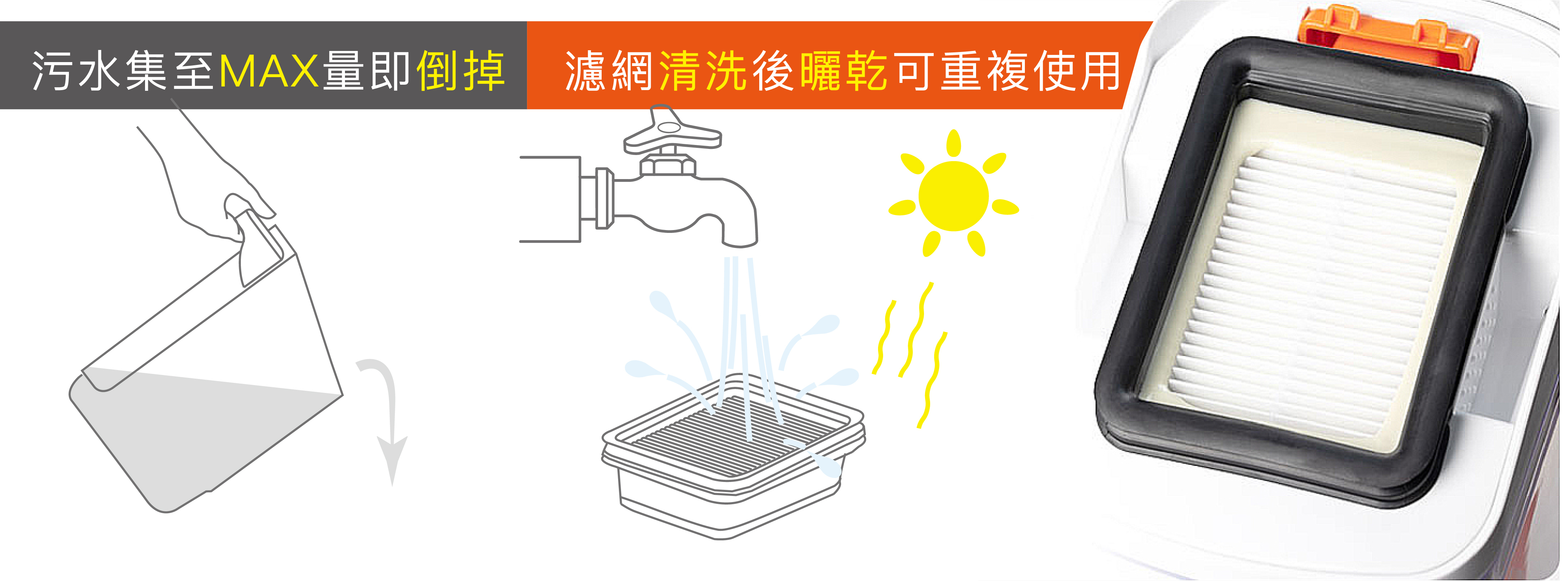 速吸拖污水箱有清楚的”MAX”標示,當污水箱呈現Max時記得將污水箱倒掉,髒水乖乖不亂跑!同時速吸拖的HEPA濾網也可以多次水洗使用,洗乾淨之後記得要晾乾,讓過濾性保持良好,吸力完整又乾淨。