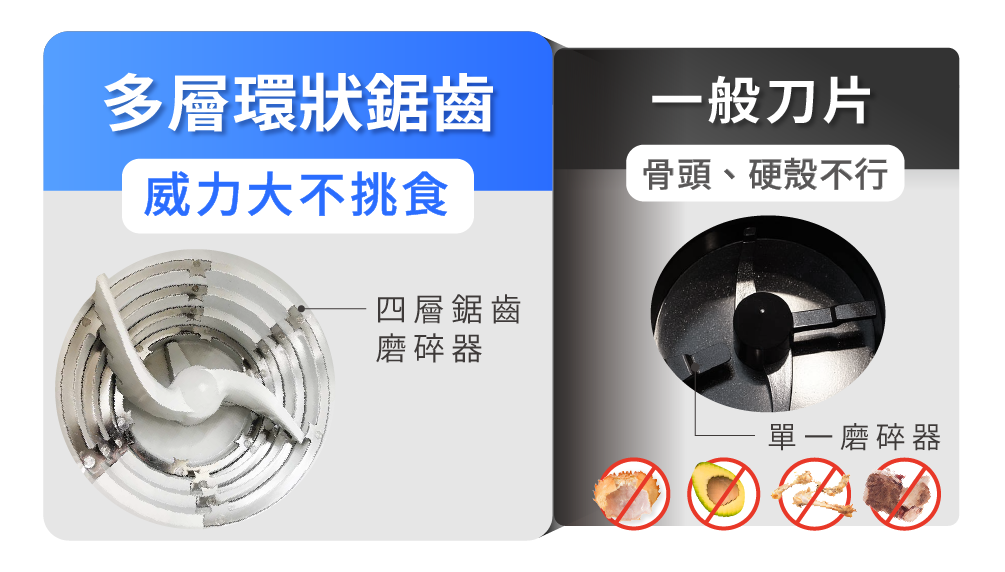 設計靈感源於非洲河馬的鋼牙,廚餘大師Pro的鋸齒可以輕鬆切斷、攪碎市售廚餘機無法處理的骨頭(如:豬羊雞骨)、菜葉高纖(如:鳳梨頭、玉米核)、澱粉麵團,無須多一步驟把廚餘切小塊,丟廚餘更隨心所欲。